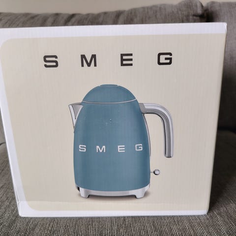 Smeg vannkoker i hvit farge. Elektrisk vannkoker med håndtak i metallfinish og tydelig Smeg-logo på siden. Egnet til koking av vann til te, kaffe og annen drikke, samt matlaging som krever kokende vann.