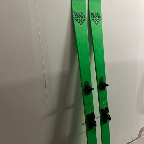 Black Crows Navis Freebird toppturski i lengde 179 cm. Skiene har en midtbredde på 102 mm (10.2 cm) og er i en tydelig grønn farge. De er utstyrt med svarte bindinger (modell ikke spesifisert på bildene).