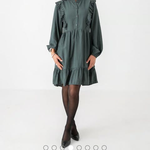 Bubbleroom festkjole for dame i størrelse S. Kjolen er grønn. Modellen har V-utringning, lange ermer og knapperekke foran på overdelen. Livet er markert, og skjørtet er lett utsvingt. Passer til bruk ved festlige anledninger og andre situasjoner der man ønsker en enkel, ensfarget kjole. Brukt kun 2 ganger.