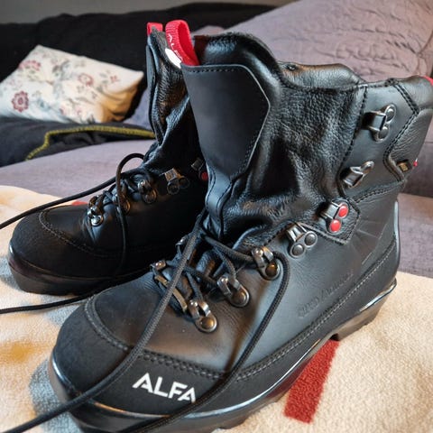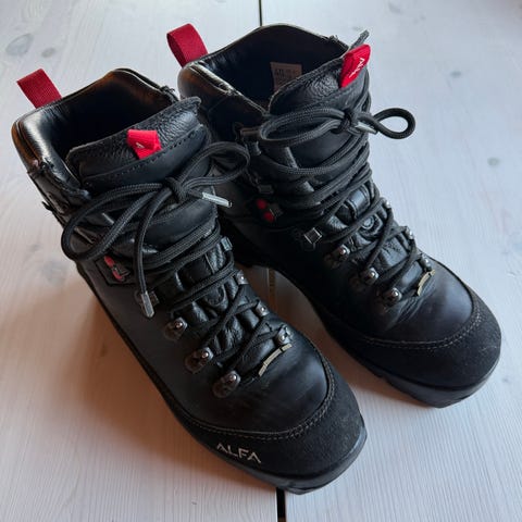 Skiskoene er er av typen ALFA, med NNN BC bindinger ("bindings stangen" er 4,1 cm lang).