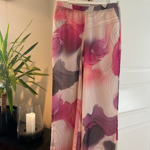 Bukse til sommeren/syden. Lett stoff i fine fargesjatteringer, strikk i midjen m/snor, lommer i sidene, falske lommer bak. Lappen på, ikke brukt.