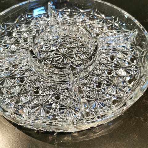 Lysegrønt serveringsfat med løse skåler, aldri brukt.