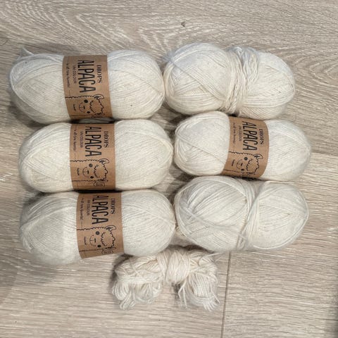 Kjøpt på Sandnes garn sitt fabrikkutsalg. 2. sortering, ukirante størrelse på nøstene. Samme partinummer