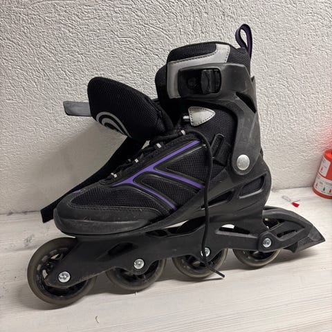 Cycab rulleskøyter i størrelse 41. Modellen har myk, polstret innersko og ytre støvel med snøring og justerbar stropp for bedre støtte rundt ankelen. Skøytene har fire hjul på hver skøyte montert i rekke på solid ramme. Farge hovedsakelig svart med enkelte lyse detaljer. Egnet til bruk på asfalt og andre jevne underlag for fritidsbruk og trening.