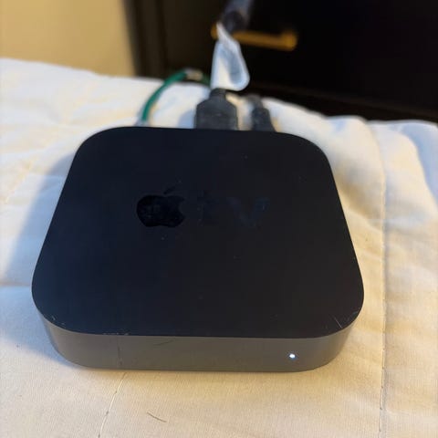Apple TV, strømkabel og fjernkontroll.