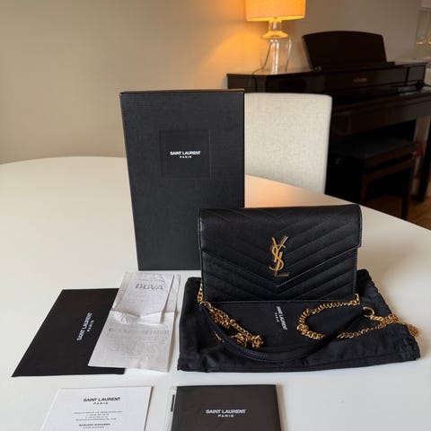 Helt ny og ubrukt clutch / wallet on chain fra Saint Laurent selges. Modellen heter Classic Cassandre Chain Wallet, og er i «grain de poudre» lær.