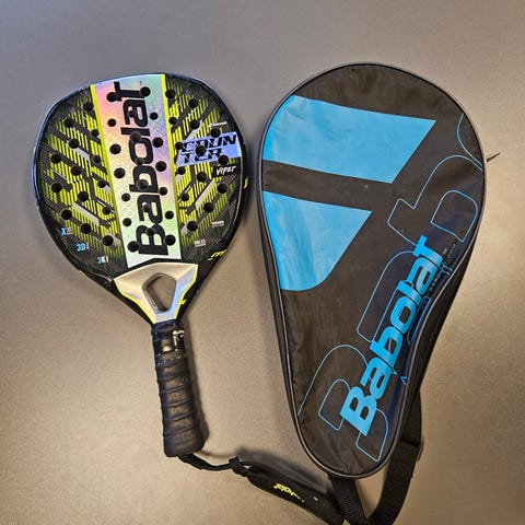 Babolat Technical padelracket . Racketen har perforert slagflate med markert struktur og tydelig Babolat-logo. Leveres med futteral fra Babolat med glidelås og bærestropp.