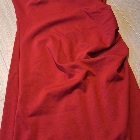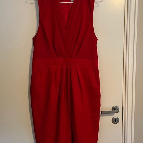 KAFFE festkjole i størrelse M for dame. Kjolen er rød og er knelang med en lett innsvinget, figurnær passform. Fronten har drapert detalj i siden, mens baksiden er glatt med enkle sømmer . Egnet som penkjole til selskap, fest og andre anledninger der man ønsker en enkel og klassisk stil.