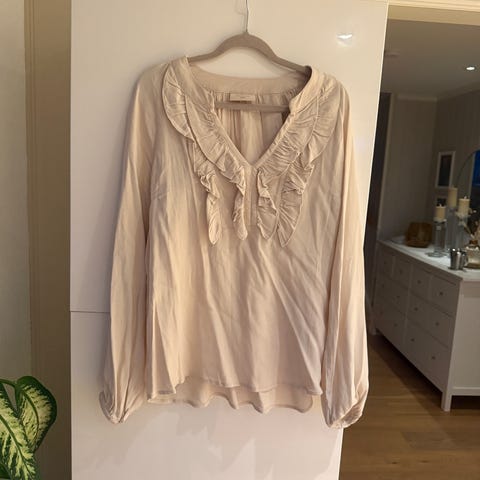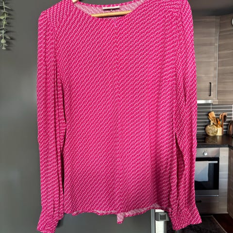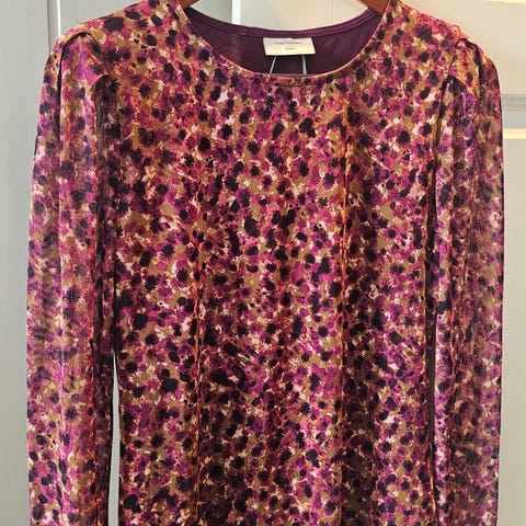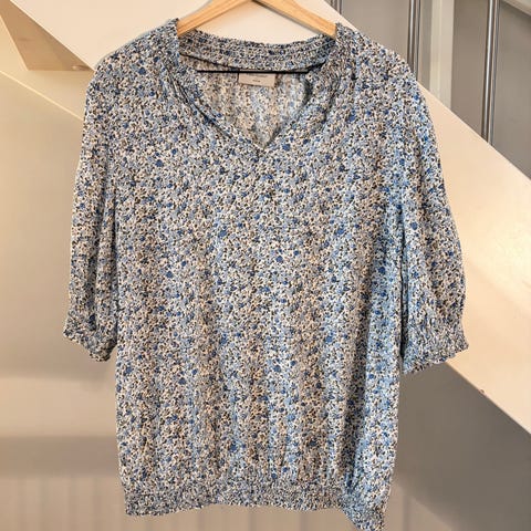 FREEQUENT bluse for dame i størrelse M. Blusen er flerfarget med blomstrete mønster og har lange ermer. Den er laget i bomull og har V-utringning med knyting og dusker foran. Stoffet er lett og luftig, egnet til hverdagsbruk eller fritid, og kan kombineres med både bukser og skjørt.