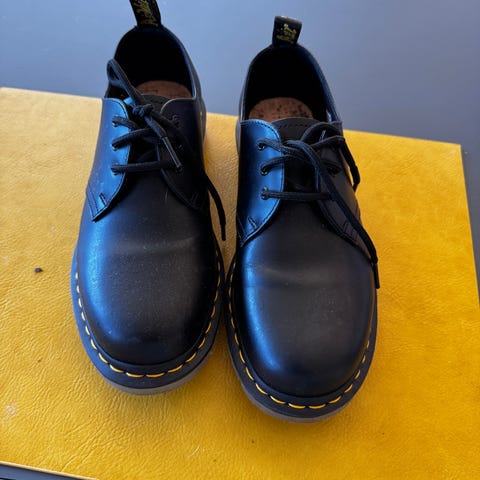 Dr. Martens pensko i størrelse 40. Skoene er i svart skinn med klassiske gule sømmer langs sålen. Modellen har snøring med tre hull på hver side og en kraftig, mønstret gummisåle. Passer som hverdagssko eller til mer formelle anledninger der man ønsker en enkel, svart skinnsko med karakteristisk Dr. Martens-utseende.