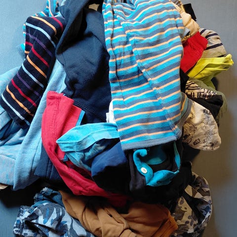 Litt brukt, men ingen flekker. Bitteliten hull i frosk tskjorte. Pakken består av: