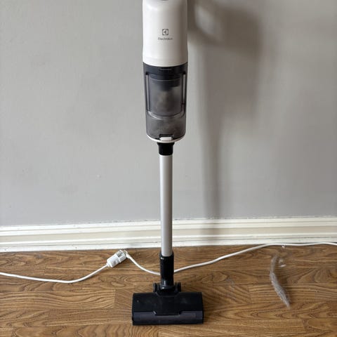 Modellen er en skaftstøvsuger med avtakbar støvbeholder og gulvmunnstykke.