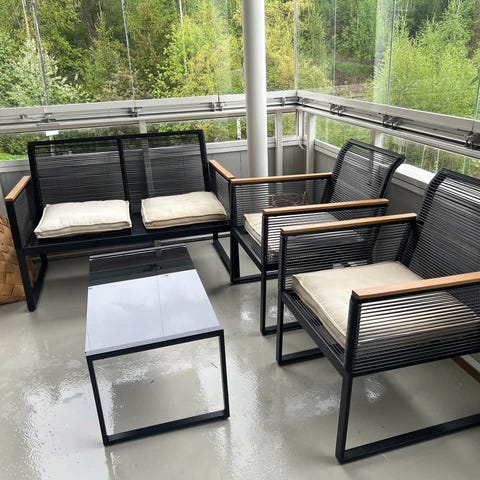 Lev livet utendørs i sommer! Komplett sofagruppe bestående av en 3-seter sofa, to komfortable lenestoler og bord med glassplate. Settet i rotting har et romantisk, men samtidig moderne uttrykk som passer både på balkongen, på uteplassen eller under et tre i hagen. Med ramme av pulverlakkert aluminium og åpen flett i kunstrotting, er det kun vask med mildt såpevann som kreves for at møblene skal holde seg fine år etter år. Lattefargede puter i olefinstoff, et materiale som er svært uv-bestandig og hurtigtørkende,anbefaler likevel at putene legges under tak når de regner. Mål: Sofa L210xD74xH73 cm, Stol L85xD74xH73 cm, Bord 130x70xH45 cm