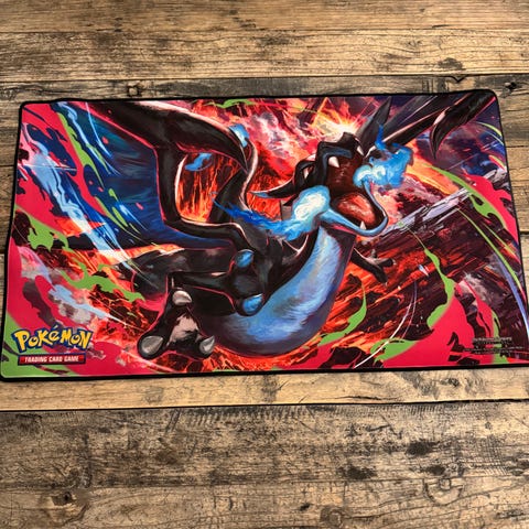 Pokémon spillmatte med Team Rocket-inspirert motiv i svart og rødt. Matten har stor R-logo og illustrasjon av en Pokémon-figur med flammeeffekt. Egnet som underlag til kortspill og bordspill, for eksempel Pokémon TCG. Myk overflate og gummiert underside som gir stabilitet på bordet.