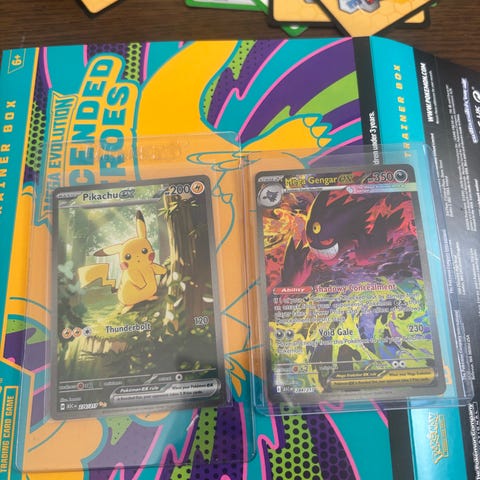 Pokémon samlekort blandet lot med ulike EX- og GX-kort. Bildene viser et utvalg av kortene, blant annet flere holografiske kort og spesialkort. Kortene oppbevares i plastlommer i en perm. Egnet for samlere av Pokémon TCG som ønsker en variert samling med forskjellige figurer og korttyper. Antall, årganger og serier kan variere innen loten slik den vises på bildene.