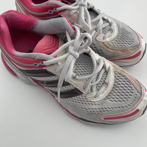 Adidas Supernova joggesko i størrelse 38. Skoene har overdel i tekstil og syntetisk materiale i rosa med gule og mørkegrå detaljer. Yttersålen har kraftig mønster som gir godt grep på variert underlag. Snøring foran med gule lisser. Egnet som joggesko eller fritidssko.