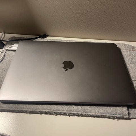 Apple MacBook Pro laptop i grå farge. Bærbar PC med tynn og lett design, helhetlig aluminiumskabinett og bakbelyst tastatur. Egner seg til generell bruk som arbeid, studier og underholdning. Nærbilder viser tastatur og overflate for inntrykk av utseende og layout.