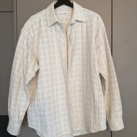 Samsøe Samsøe skjorte for herre i størrelse M. Skjorten er beige og laget i 100% bomull. Den har krage, knappelukking foran og brystlomme på venstre side. Mansjettene har knapper, og stoffet har en strukturert overflate. Passer som en lett overskjorte eller til hverdagsbruk.