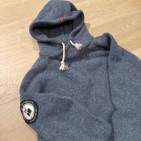 Amundsen hettegenser for dame i størrelse XS. Genseren er i blå ull med hette og snøring i halsen. Ermene har strukturstrikk, og det er patch-detalj på overarmen. Passer som varm mellomlag eller ytterplagg i kjøligere vær.