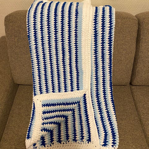 Gøyalt hekletpledd i friske farger. Antar det er ullgarn😊 Størrelse er ca 160x190.