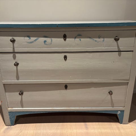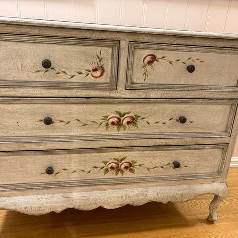 Rosemalt liten kommode. Håndmalt i 1983. 2 skuffer. Signert med Berit.