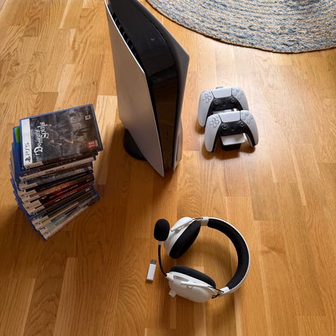 Sony PlayStation 5 spillkonsoll i hvit farge. Konsollen støtter spill i høy oppløsning, rask lagring med SSD og har trådløs DualSense-kontroller. Egnet for tilkobling til TV eller skjerm via HDMI for spilling, medieavspilling og nettbaserte tjenester, avhengig av modell og tilkoblingsmuligheter.