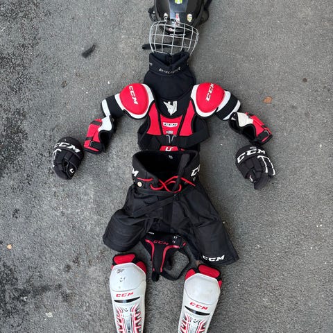 CCM utstyrsett for barn. 7-9år *Se størrelsesovrsikt på et av bildene. Settet inneholder brystvern shorts, albuebeskyttere, leggskinn og susp. Hansker mangler, men susp er med.