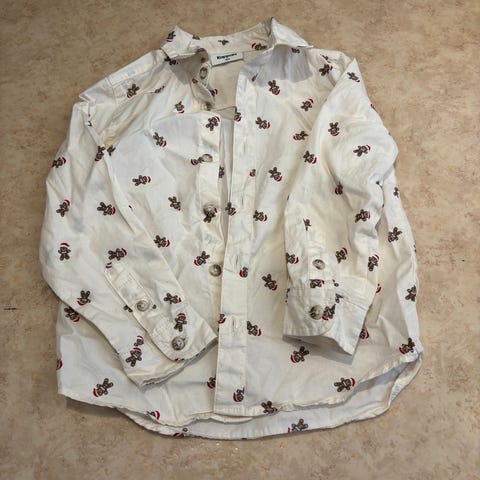 Gutteklær med julefarger og motiv i størrelse 98 og 104. Settet består av en rød bukse, en stripete genser, en mørk genser med trykk og en hvit langermet body med krage og knappestolpe. Se bilde to for svak flekk på genser.