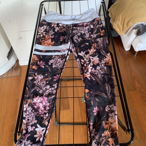 Bara Sportswear treningstights for dame i størrelse XXL. To ulike tights vises på bildene: én helsvart og én med flerfarget bladprint.