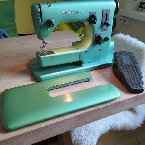 Tøff retroHusqvarna Automatic symaskin i grønn farge. Mekanisk modell med fotpedal, regulering for stinglengde og ulike innstillinger på frontpanelet.
