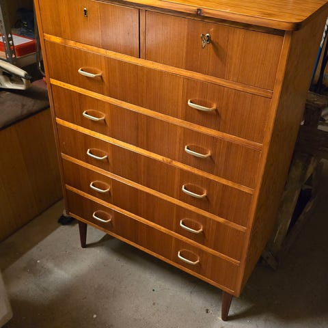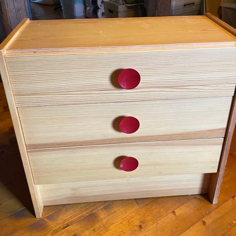 God, gammel kommode i tre. Malt i en frisk grønn farge og fått grep (hvit/rød) fra IKEA. Denne har stått på barnerom hos oss i årevis. Nå vil vi selge den for å få bedre plass.