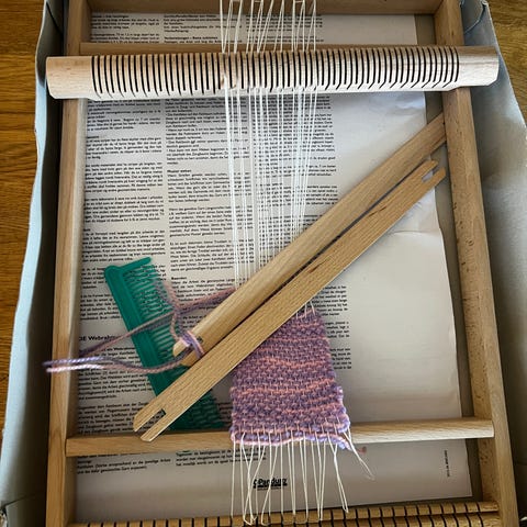 Stor vevremme av robust plast som settes sammen av 8 deler. Inkl. nål og vevkam i samme kvalitet.