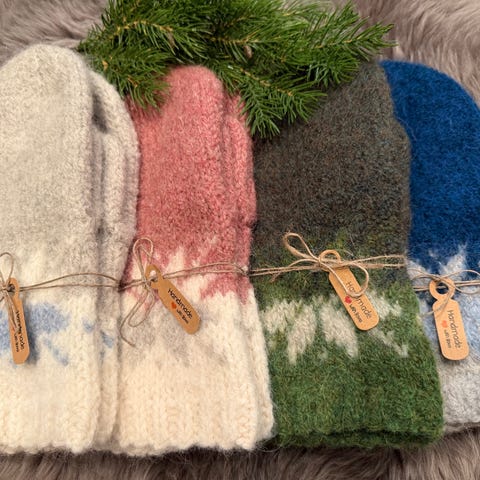 Tova Mariusvotter og åttebladsrose , strikket i Sandnes Fritidsgarn 100%ull, varme og gode!