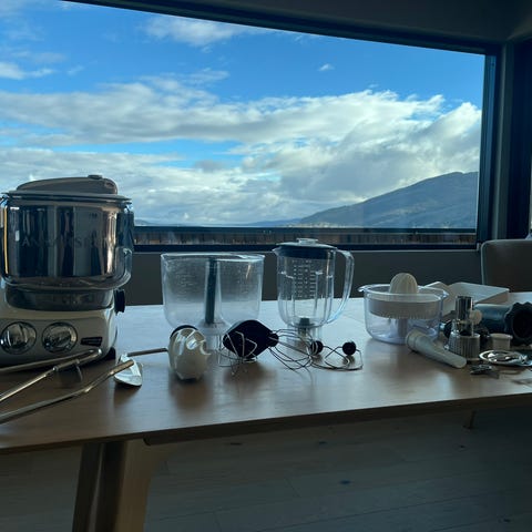 Ankarsrum kjøkkenmaskin med hvit base og bolle i rustfritt stål. Maskinen leveres med visper, deigkroker, deigskrape og andre røreverktøy som vises på bildene. Det følger også med en oppskriftsbok tilpasset Ankarsrum-maskinen.