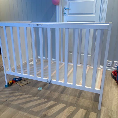 Lekegrind i hvit farge. Rektangulær modell med sprosser på alle sider og hel bunnplate i tre. Egnet som trygg lekeplass eller hvileplass for små barn innendørs. Passer i stue, barnerom eller andre oppholdsrom der man ønsker en avgrenset plass til barnet. Noen synlige bruksmerker.