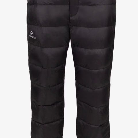 Mountain Hardwear dunbukse i svart farge, størrelse L. Buksen er fylt med minimum 90 % dun, noe som gir høy isolasjon. Yttermaterialet er vanntett og laget av ripstop. Buksen har dropseat som gjør det mulig å gå på do uten å måtte kle av seg. Glidelåsene er tapet for å forhindre snø/vann inntrenging. Buksen kan glides av uten å måtte ta av sko. Dette er en ekstremt varm bukse med svært lett egenvekt. Er ikke i salg mer. Helt ubetydelig brukt. Ingen slitasje eller bruksmerker. Fremstår som ny. En perfekt bukse til deg som fryser lett og som er opptatt av kvalitet