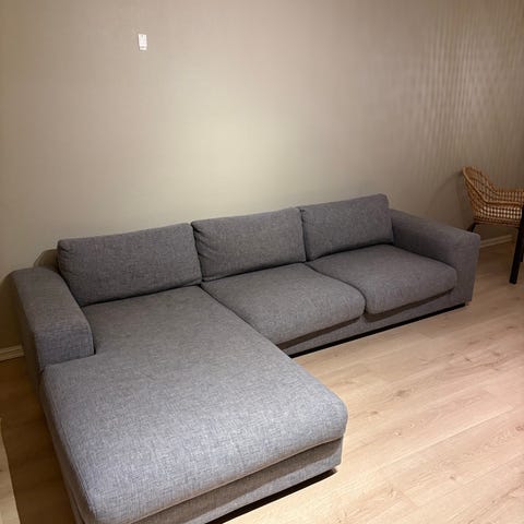 Beige Orlando sofa fra Home and Cottage med sjeselong. Sjeselongen er 180 cm dyp.