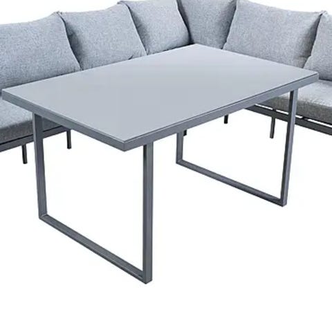 Sofaen er utformet som en hjørnesofa med rette linjer og løse sitte- og ryggputer i grå tekstil (polyester/PVC). Rammen er i stål med tynne, rette ben. Setehøyden er ca. 47 cm. Sofaens monterte mål er ca. bredde 240 cm, dybde 183 cm og høyde 76 cm.