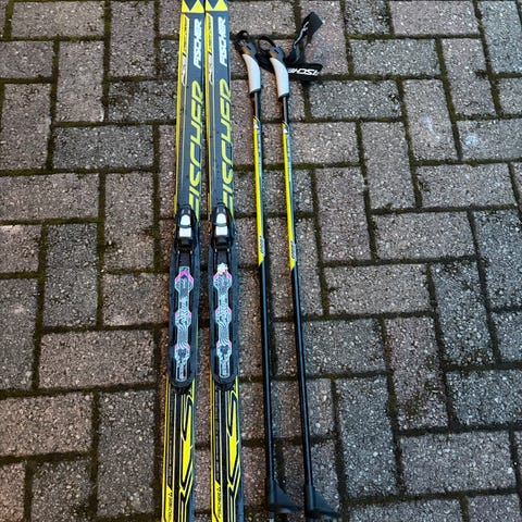 Fischer RCR langrennski. Klassiske langrennski med Fischer-logo og markant gul/svart design. Passer til langrenn på preparerte løyper. Bindinger er montert på skiene, type ikke spesifisert. Egnet for brukere som ønsker et par trenings- eller turorienterte langrennski fra Fischer sin RCR-serie.