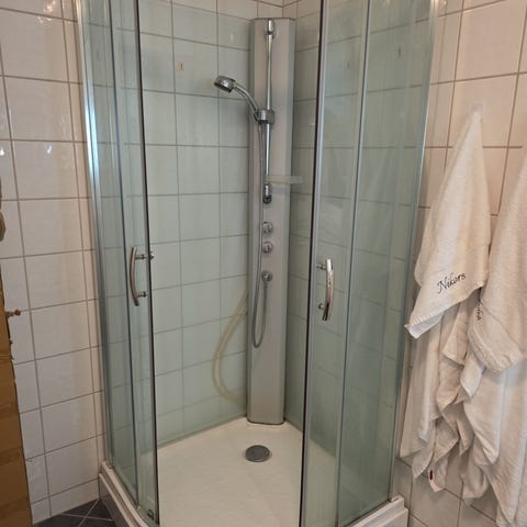 Dusjkabinett med hvit ramme og glassfelt. Kabinettet har skyvedører og er utformet som et hjørnekabinett med dusjkar i bunn. Det er montert blandebatteri og dusjslange med hånddusj. Egnet for montering på bad der man ønsker en avgrenset dusjsone med faste vegger og dører.