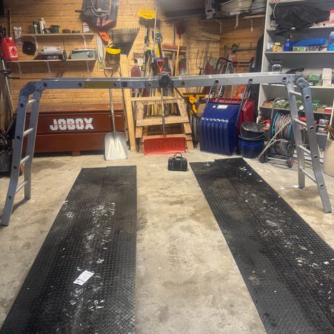 Står oppå en hems med trapp, må bæres ned selv. Må nok demonteres men dette er lett.
