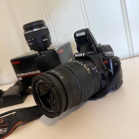 Sony speilreflekskamera med utskiftbar optikk. Kameraet leveres med Tamron 55–200mm zoomobjektiv, som dekker normal- til teleområde og passer til blant annet portretter og motiver på avstand. I tillegg følger det med original Sony batterilader med batteri, samt en polstret kameraveske med skulderreim og flere lommer for oppbevaring av kamerautstyr og tilbehør.