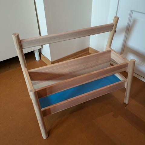 IKEA FLISAT bokhylle til barn i tre med blå bunnplate. Bokhyllen er lav og tilpasset barn, slik at bøker kan plasseres med forsiden ut og være lett tilgjengelige. Egnet for oppbevaring av barnebøker og lignende i barnerom eller lekeområde.