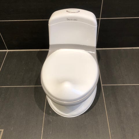 Beemoo potte i hvit plast. Utformet som et lite toalett med lokk og avrundet sittering tilpasset barn. Egnet til bruk ved do-trening og som egen potte på badet eller barnerommet. Lett å plassere på gulv og enkel å rengjøre takket være glatte overflater.