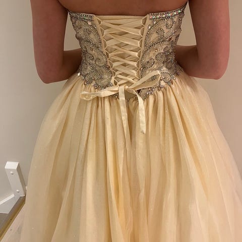 Pent brukt ballkjole i str M-L. Justerbar grunnet snøring i ryggen. Brukt på skoleball.