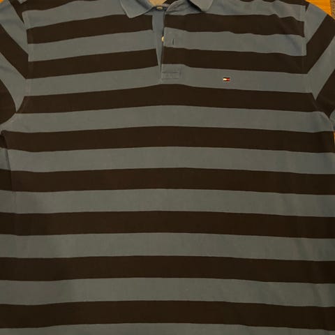 Tommy Hilfiger pique for herre i størrelse XXL. Piquen er svart med horisontale striper og har liten Tommy Hilfiger-logo på brystet. Laget i bomull for myk og behagelig bruk. Passer til hverdagsbruk eller mer avslappede anledninger.