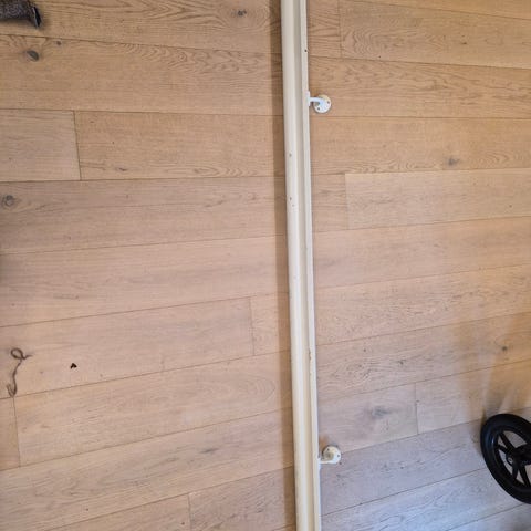 2 stk 140 cm lange teak gardinbrett fra Royal Fabrikker i Haugesund. I originaleske, den ene er aldri hengt opp (heller ikke tatt ut) så vidt jeg kan se. Den som er tatt ut av eske har en ørliten skade på høyre side, se bilde. Ikke synlig når den henger oppe.