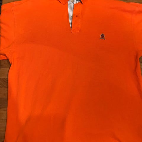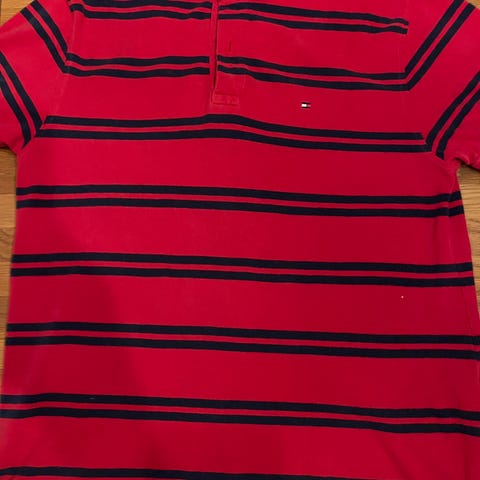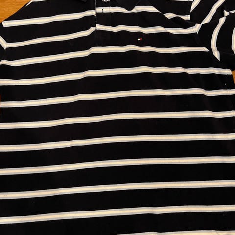 Tommy Hilfiger poloskjorte for herre i størrelse L. Skjorten er laget av bomull og har brede horisontale striper i flere farger, med typiske Tommy Hilfiger-detaljer. Kortermet modell med krage og knappestolpe. Passer til hverdagsbruk og uformelle anledninger.