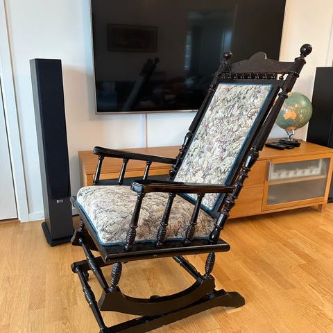 Amerikansk gyngestol i tre med brodert trekk og utskårne detaljer i rygg og dreide ben. Sete og rygg har lyst tekstiltrekk med brodert blomstermønster i flere farger. Stoffet er festet med dekorative nagler langs kantene. Egner seg som sittemøbel i stue, lesehjørne eller tilsvarende oppholdsrom.