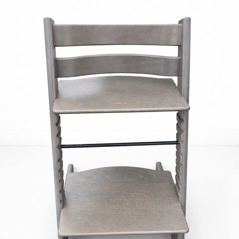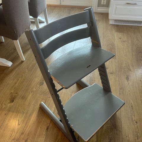 Stokke barnestol i grå farge. Klassisk Tripp trapp stol med justerbart sete og fotbrett som kan tilpasses barnets høyde.